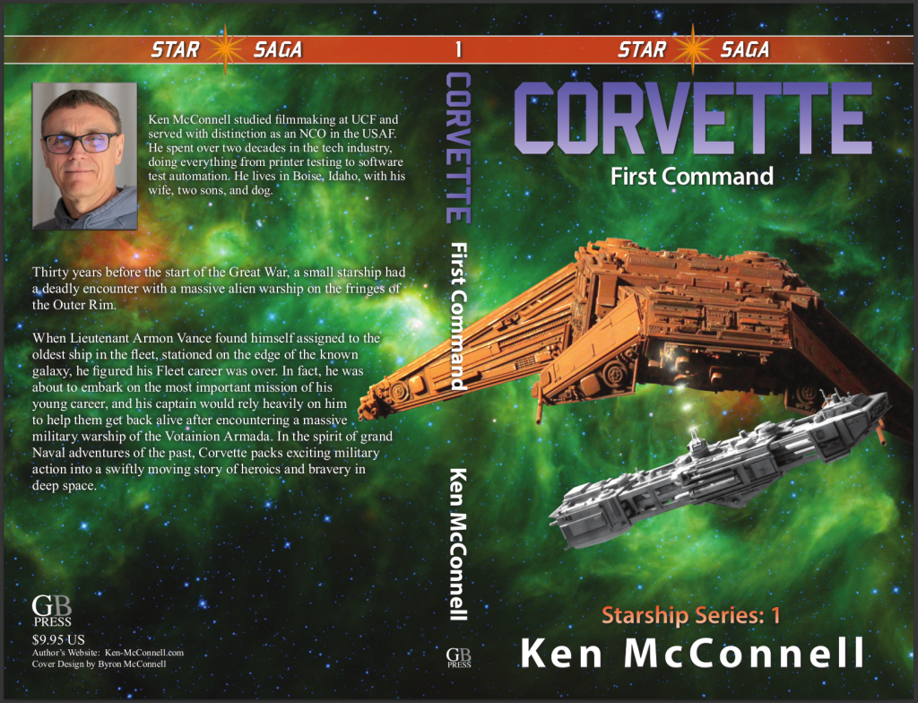 The second change is to the title or rather the subtitle, which is now First Command. This is because there are three books labeled Corvette in this series and so each has a different subtitle. We identify which book in the series on the front cover with Starship Series: 1. On the spine, we have a 1 to make it clear what order to shelve the book.